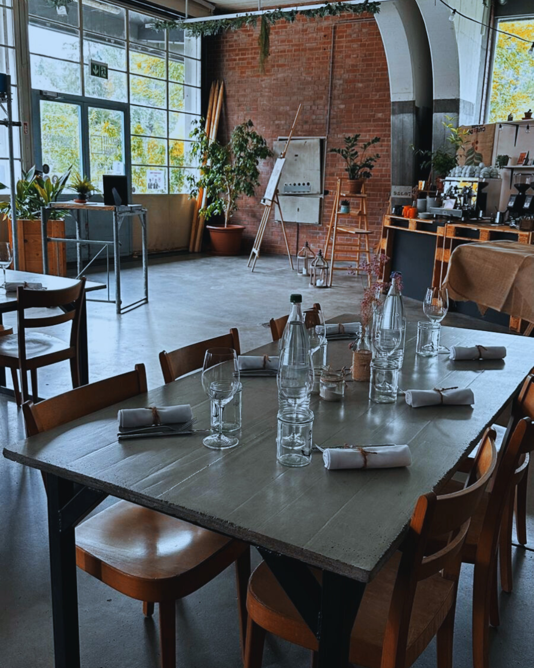 Die ehemalige Lagerhalle bietet viel Fläche und gestalterischen Spielraum. Ob Firmenfeier, Apéro, Konzert oder kultureller Anlass – die Eventfläche lässt sich flexibel bespielen und an unterschiedliche Formate anpassen. Der rohe Industriecharakter, kombiniert mit Holz und Pflanzen, schafft eine lockere, authentische Atmosphäre.