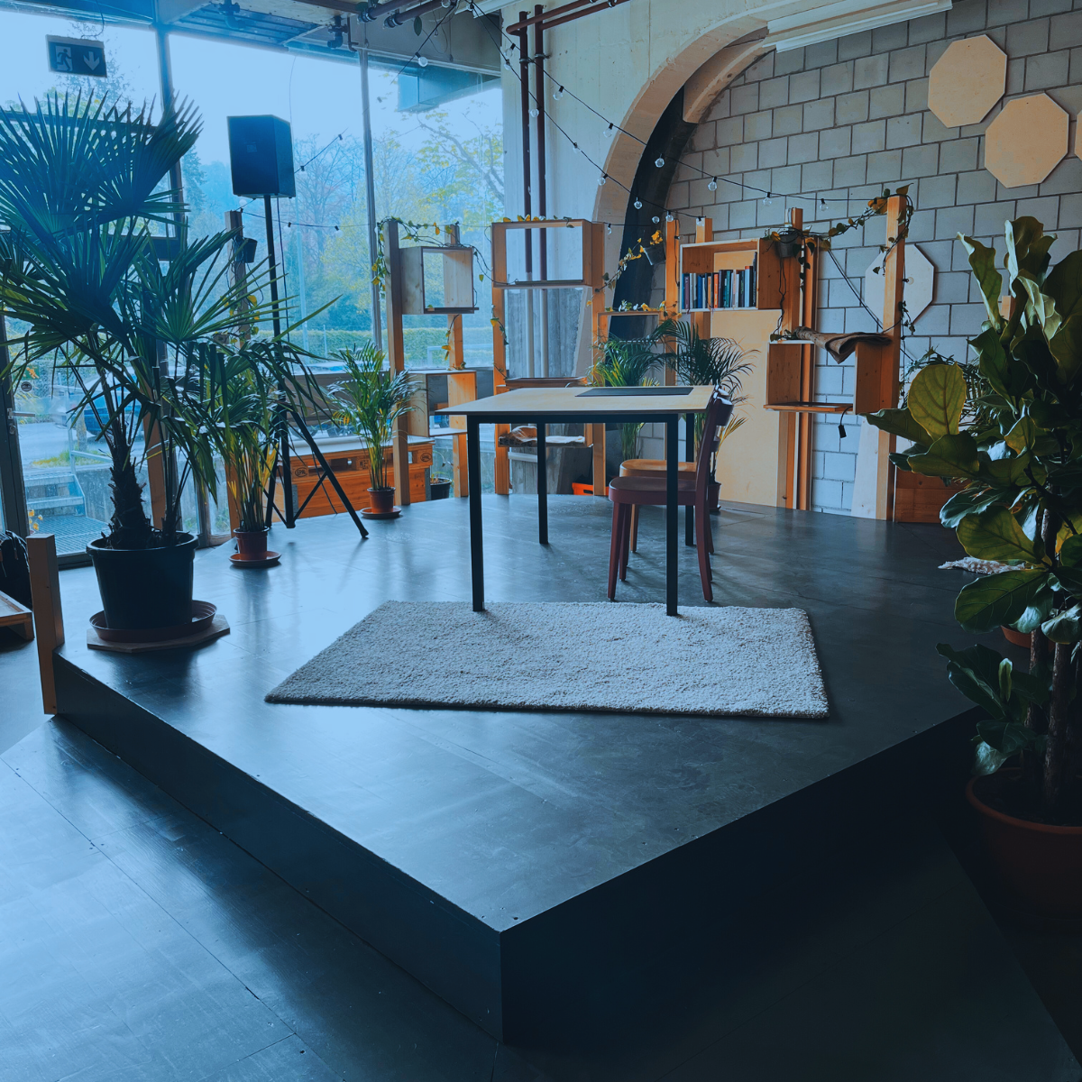 Grosszügige Eventfläche mit Lagerhallen-Charakter, viel Holz und Pflanzen. Der Raum lässt sich individuell gestalten und flexibel bespielen. Ideal geeignet für Firmenfeiern, Apéros und Konzerte.