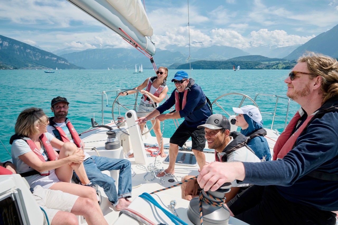 After casting off, the shared sailing experience on Lake Thun begins. The instructors explain the basics, give tasks and adapt the pace to the group.